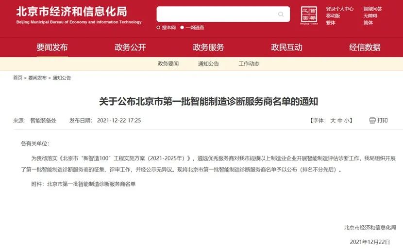 北京市经济和信息化局于今年9月组织开展了诊断服务商的征集、评审工作,并于近日公布了“北京市第一批智能制造诊断服务商”正式名单,兰光创新成功入选。