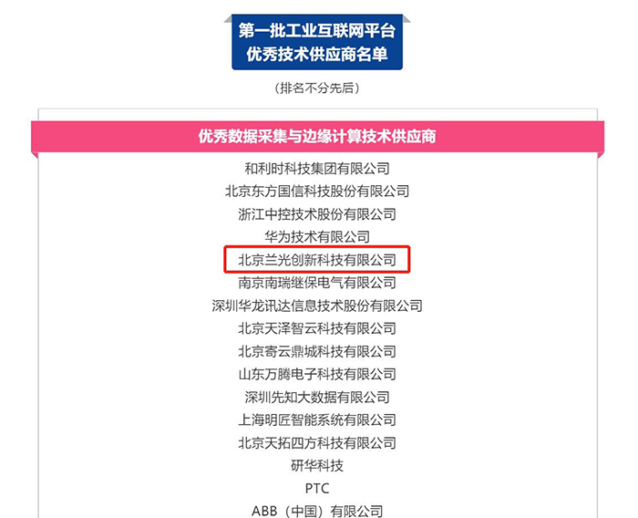 2018年12月19日,工业互联网产业联盟发布我国“第一批工业互联网平台优秀技术供应商”名单,兰光创新凭借在工业互联网领先的技术实力与良好的市场口碑,与华为、东方国信等国内知名企业一同成功入选。