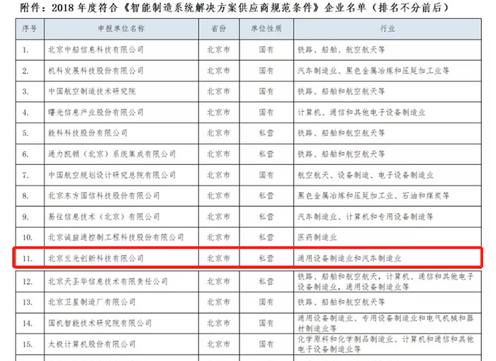 作为智能制造界的另一件大事,2018年12月21日,中国智能制造系统解决方案供应商联盟正式公布了2018年度符合《智能制造系统解决方案供应商规范条件》企业名单。作为国内专业的智能工厂解决方案供应商,兰光创新成功入选。