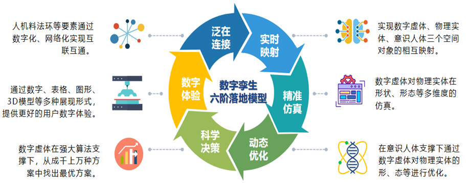 泛在连接是通过在数字虚体中进行建模,在意识人体、数字虚体、物理实体之间进行建立关联;在生产、管理及售后运维等环节将人、机、料、法、环、测等要素通过数字化、网络化实现互联互通。