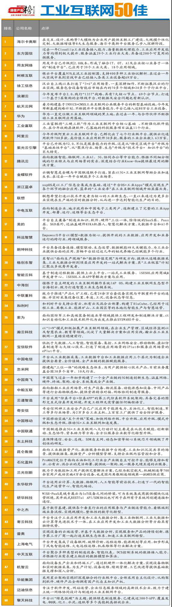 “工业互联网50佳”榜单