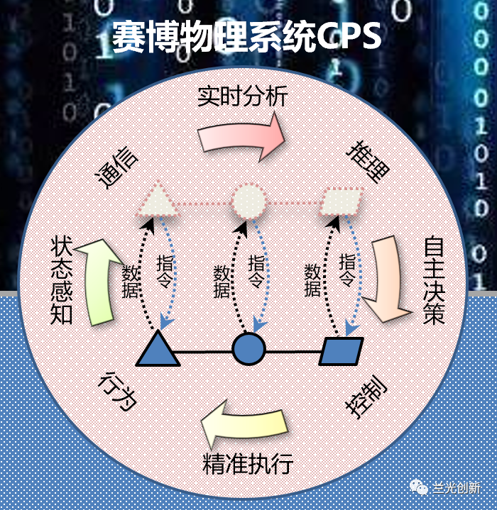 在数字孪生体基础上,数据不断被感知和采集,从“△○□”物理实体设备上行到其数字孪生体。如果数字孪生体中的软件按照预先设定的模型和规则,经过分析、推理之后,给出该场景下最适宜的控制指令,控制指令从数字孪生体下行到物理实体设备的控制器,驱动设备的执行器精准动作,以实现对物理实体设备更好、更精确的控制,这是CPS的实质内容。在技术上,完成了四个大箭头所表示的“状态感知、实时分析、自主决策、精准执行”的智能闭环[1]。如图2所示。