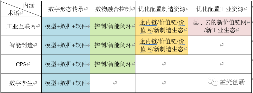 差异点:在内涵/实质上则是各不相同。数字孪生主要是在赛博空间对物理实体与业务流程等现实对象进行映射、仿真、优化和数据支持等数字形态传承类的活动,重在数字体验,以期最大幅度地通过优化数字孪生体而提升物理世界的材料、时间、能量、人力等作业效率与质量;数字孪生体与物理实体相融合,引入控制功能形成智能闭环后,形成了CPS,强化了对物理实体的形和态的精准控制;多个多级别的CPS彼此互联而构建了智能工厂,基于企内链、价值链、价值网络完成特定领域的工业要素集成与制造管控,优化配置制造资源,形成新制造生态;工业互联网则是将智能制造系统进一步离散化、解构与重构,实现海量工业要素的泛在联接,超越企业边界管控物理设备(特别是在用品),在更大的范围内优化配置工业资源,形成新工业生态。这是一种由企业内到企业外,由在制品到在用品,由价值链网到新价值链网,由新制造生态到新工业生态的数字化转型过程。表1列出四个术语之异同以及从左到右的数字化转型升级过程。