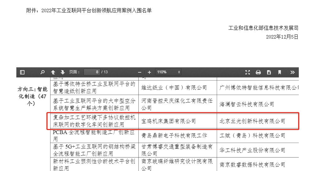 与宝鸡机床联合入选工信部“2022年工业互联网平台创新领航应用案例”名单