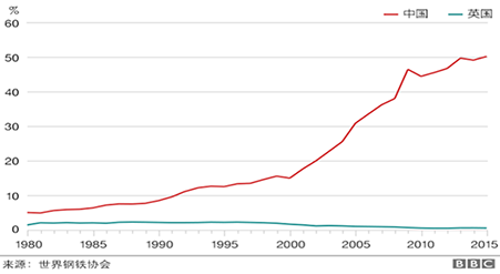 图3是世界钢铁协会统计的中国在全球钢铁生产的占比情况,中国钢铁在2000年以后,产能如脱缰野马,一路狂奔,直线上升,即便是2009年金融危机后,产能也是在持续增长。在中国耀眼的光芒下,老牌工业国家英国的产能在一路走低,形成了鲜明的对比。