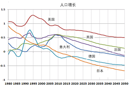 图7 主要工业国家人口增长率 (来源:美国Census Bureau)