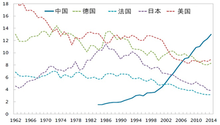 美国波士顿咨询公司的一篇报告就警告道:“欧洲机械制造商必须意识到,竞争环境已经改变,必须对越发明显的威胁做出反应,否则他们将被来自中国的咄咄逼人的挑战者打倒。” 自八十年代后期,德国、美国、日本、法国这些发达国家出口在全球的份额,从整体上呈现下降态势,与之形成鲜明对比的是,中国则是在快速增长,特别是2000年以后,一直处于高速增长中,请见图8。