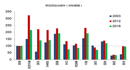 但是,中国制造业也正面临着巨大的压力。对外,面临着高端制造业回归美国等发达国家,低端制造业向东南亚等低成本国家转移的“双重挤压”。对内,面临着人力成本快速上升,人口红利逐渐消失、产业结构不合理以及粗放型发展模式不可持续等问题。中国以往高速增长的三驾马车:投资、内需与外贸,也都面临着严峻的问题,概括起来就是内需不振、外贸低迷、投资谨慎。经济下行压力非常大,中国进入了一个由高速发展到中低速发展的“新常态”。近些年来,随着中国人力成本的快速增长,与其他工业国家与地区相比,中国的成本优势几乎不复存在。从图9上可以看到,近十年来,中国劳动力成本在翻番地增加,而美国基本没有变化。牛津经济研究院经过评估后认为,在单位劳动力成本方面,中国只比美国微弱领先4%。