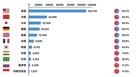 从经济规模上看,2016年美国数字经济规模高达10.8万亿美元,遥遥领先其他国家,是中国的3.2倍(中国在2016年是22.6万亿人民币),日本的4.7倍,德国的5.3倍,英国的7.1倍,法国的11.3倍。