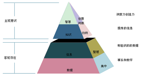 我们从知识阶层图或叫DIKW模型上看,数据层是最基础的数字或者字符,具有逻辑的数据构成了信息层,通过提炼与归纳形成知识,最高层次是人类所特具有的智慧,是基于知识的创造力。